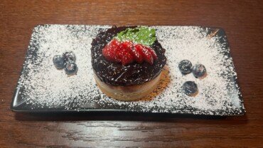 Chirardelli chocolate log with petit beurre biscuits, whipped cream and glazed almond crumbs