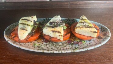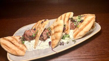 A curated selection of eggplant dip, tzatziki, spicy feta dip, hummus, dolmades, kalamata olives, gigantes, and toasted pita bread