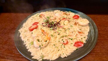Sautéed shrimp, onions, garlic, & orzo tossed in olive oil and Parmigiano