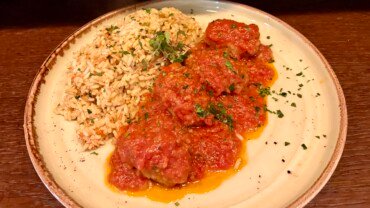 Beef and pork meatballs baked in tomato sauce, served with seasoned rice