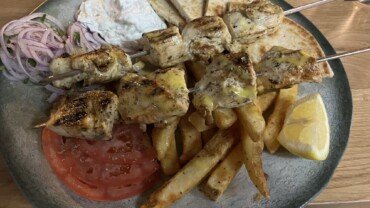 Seasoned pork tenderloin kebabs served with sliced tomatoes, onions, tzatziki, fries, and toasted pita